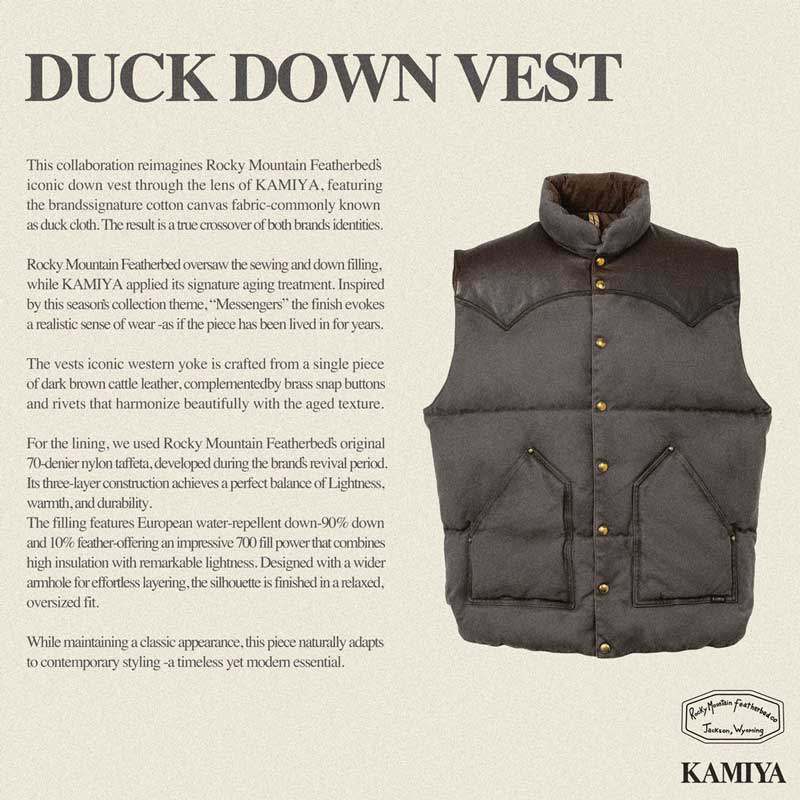 本コラボレーションでは、Rocky Mountain Featherbed の定番ダウンベストをベースに、KAMIYAのコットンキャンバス生地〈通称ダック生地〉を採用し、両ブランドのアイデンティティをクロスオーバーさせました。