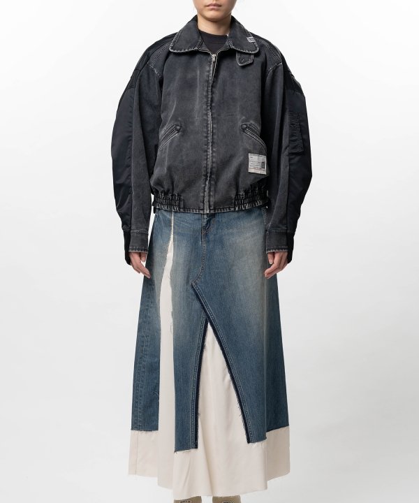 コンビ素材のデニムパンツ。